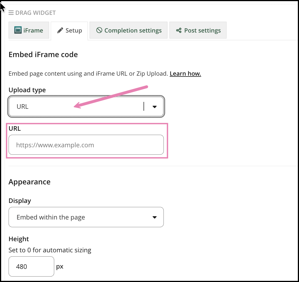 Paste the URL from step 3 into the iFrame widget and make the following edits to it: