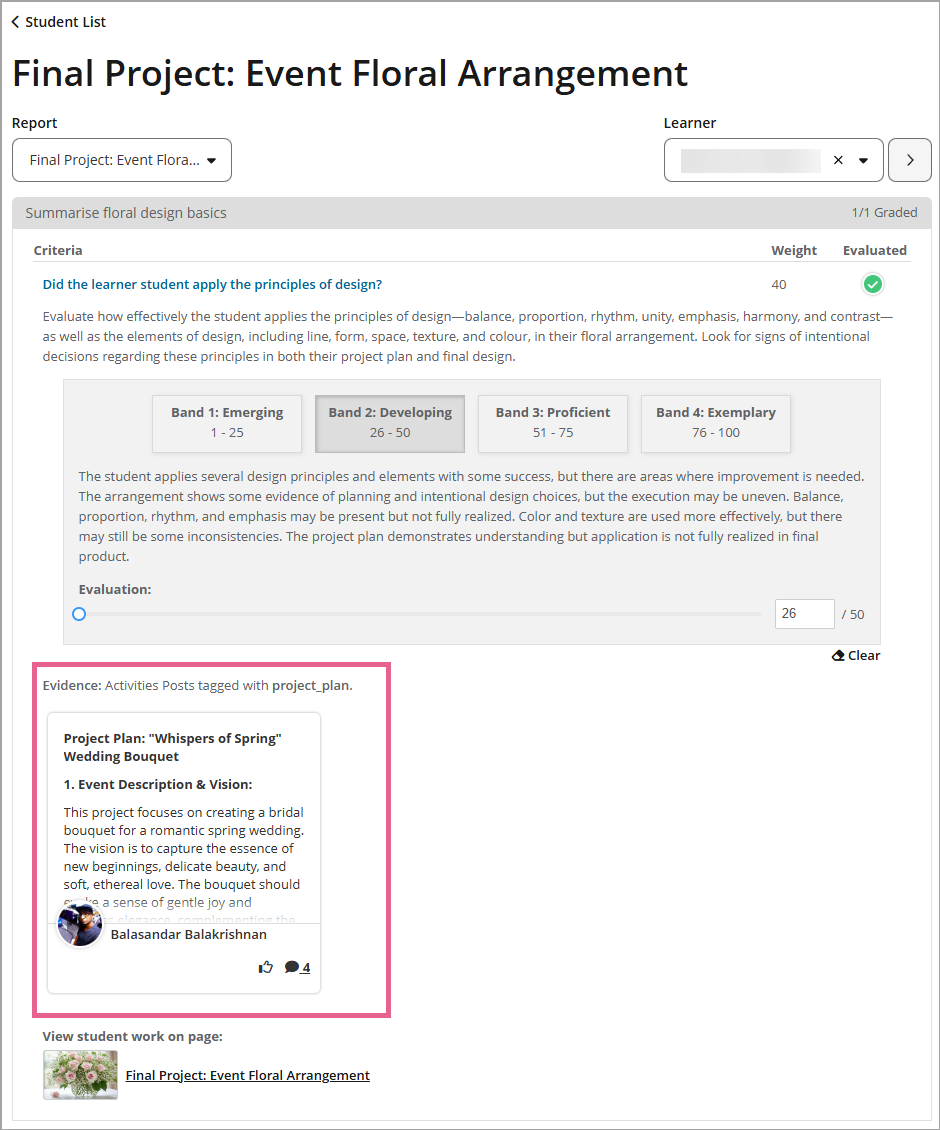 Outcome tags can be used in the Grade item – Outcomes report to collect and display learners’ work relevant to a specific outcome. Learn more about the Outcomes report.