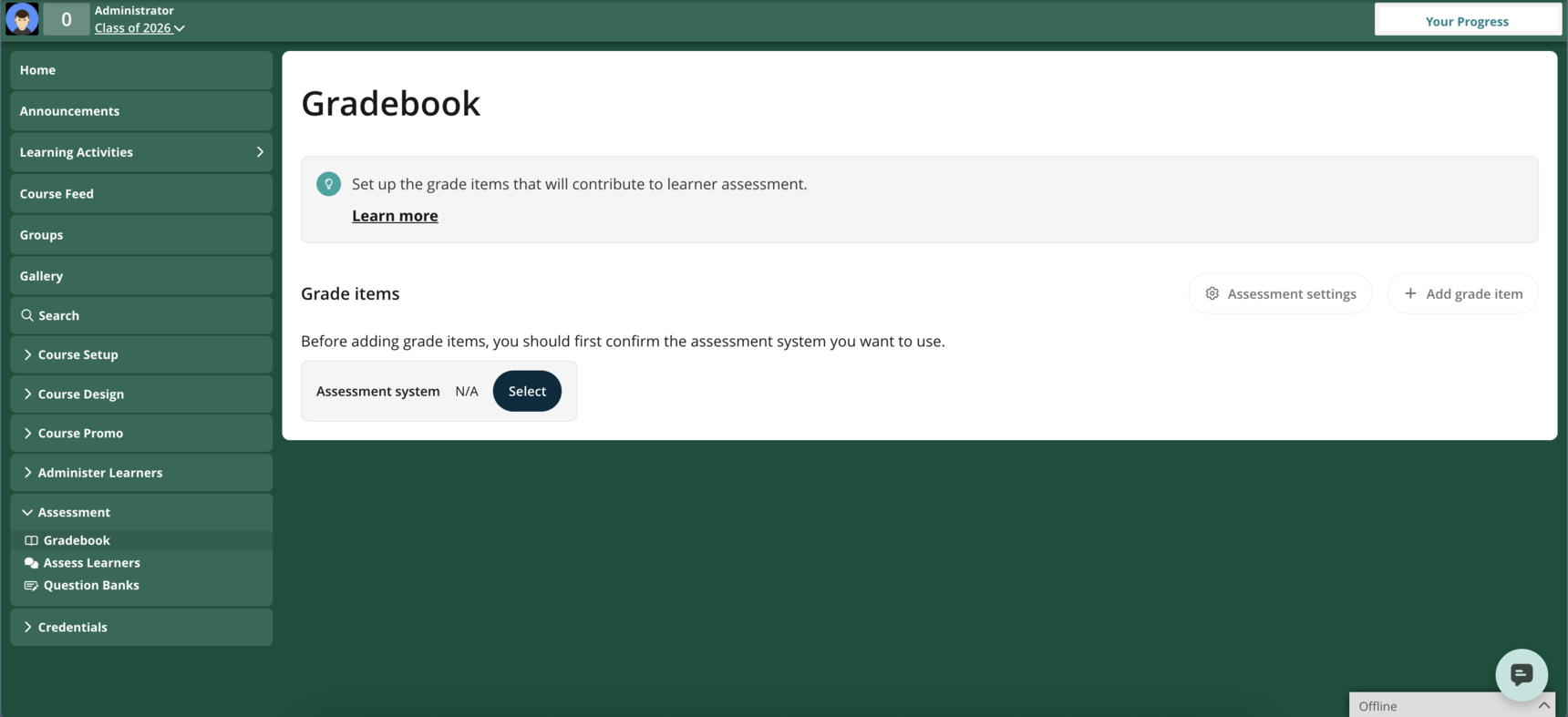 When you create a new class from scratch (not using quick creation), you'll be prompted to select your assessment system before adding grade items.
