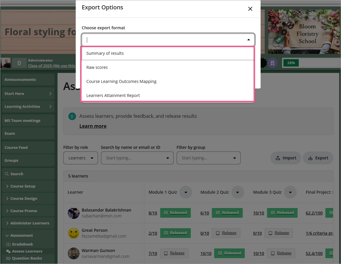 - Raw scores: Detailed scores for every learner and grade item. Use this if you need to scale or manipulate scores outside the platform or if you plan to re-import updated results back into OpenLearning.