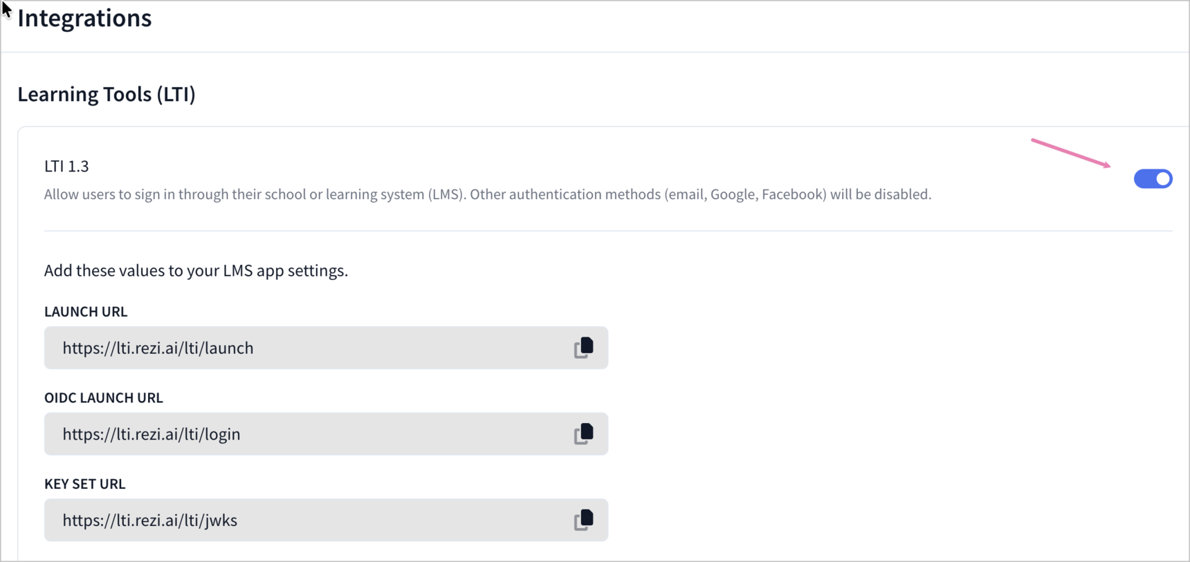Next, toggle the LTI 1.3 button to Enable it. This will make the LTI settings visible for you to copy.