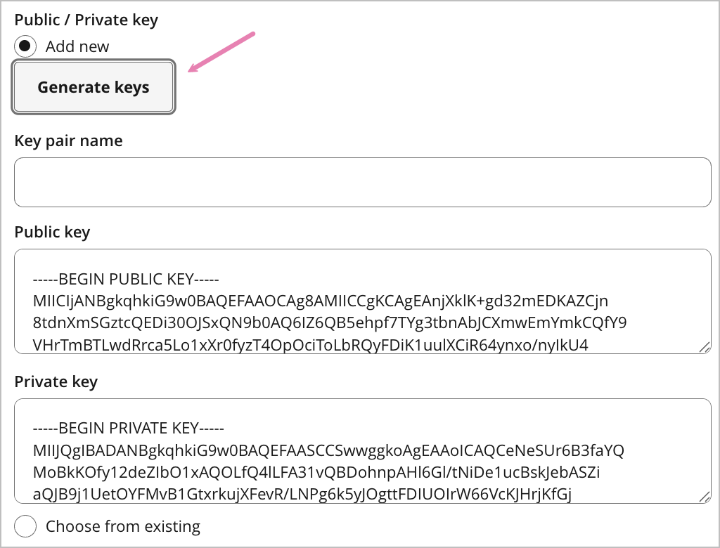 Scroll down and enter a Key pair name and click on Generate keys to get a public/ private key pair.