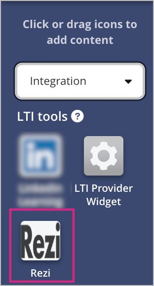 Go to the Widget menu and select Integration from the category dropdown. Click or drag the Rezi widget icon onto your page as with any other widget.