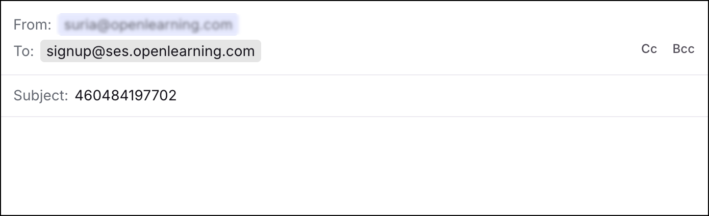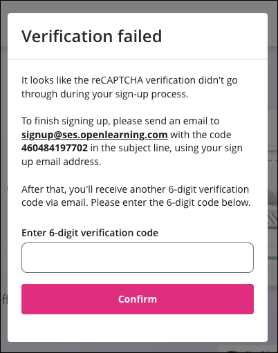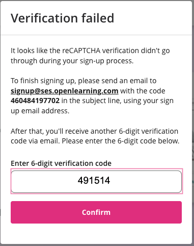 If the reCAPTCHA test is not passed, the system prompts the user to complete an additional email verification step. The user is instructed to send an email to signup@ses.openlearning.com with the generated unique code to be added in the email subject line.