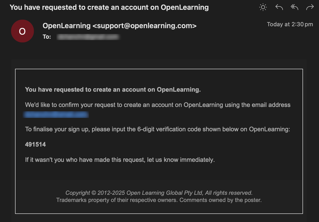 To maintain the integrity of the platform and protect against automated spam registrations, OpenLearning has introduced an additional email verification step for users during enrolment. This safeguard is triggered only when a user fails the initial reCAPTCHA challenge, ensuring that the account creation process is being completed by a genuine person rather than a bot.
