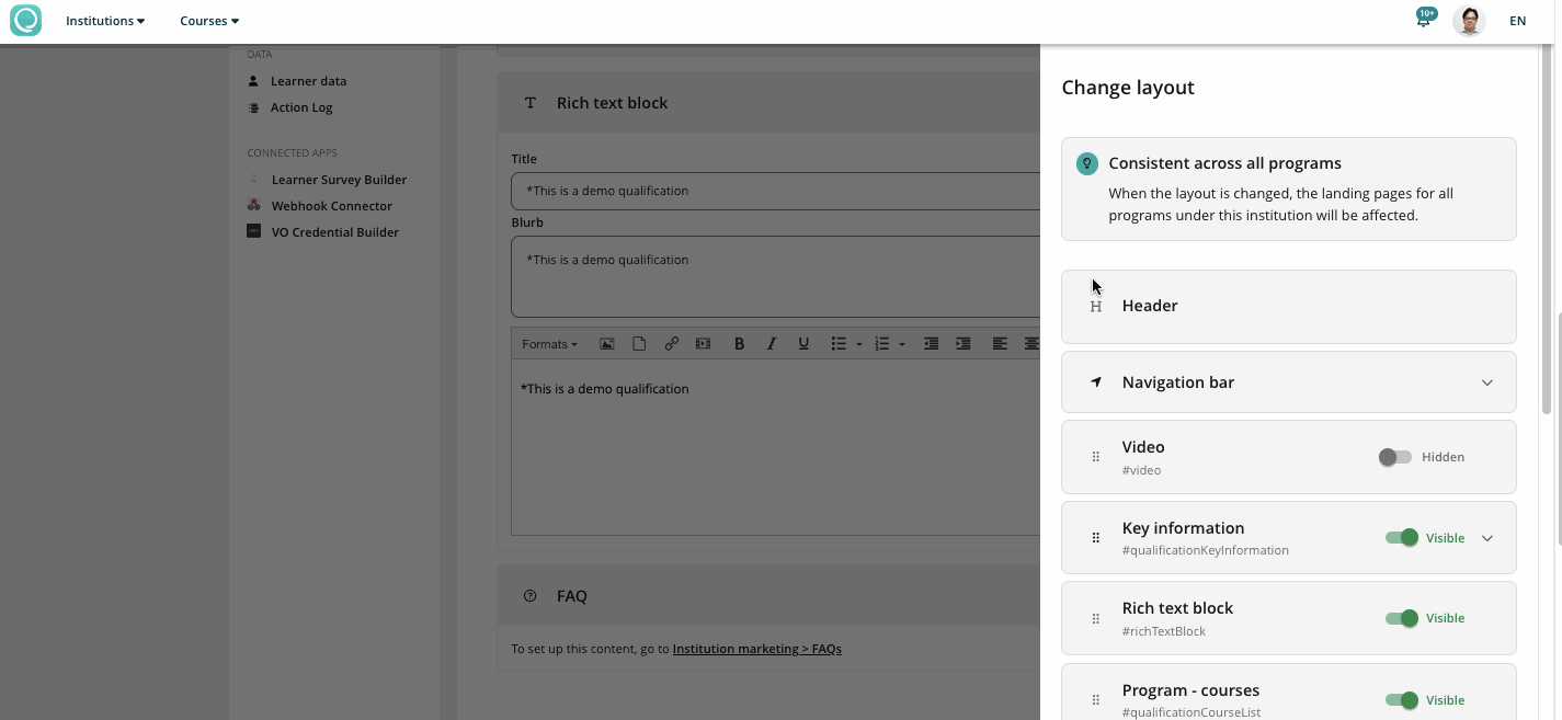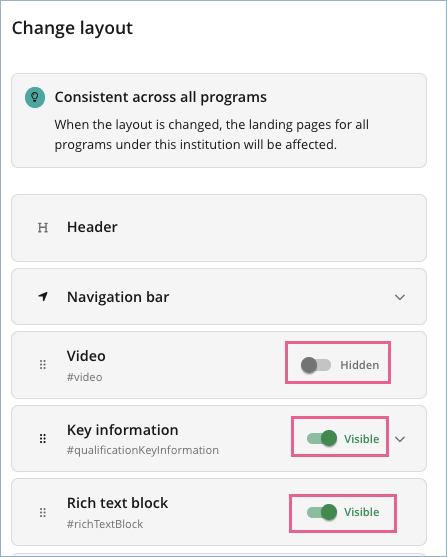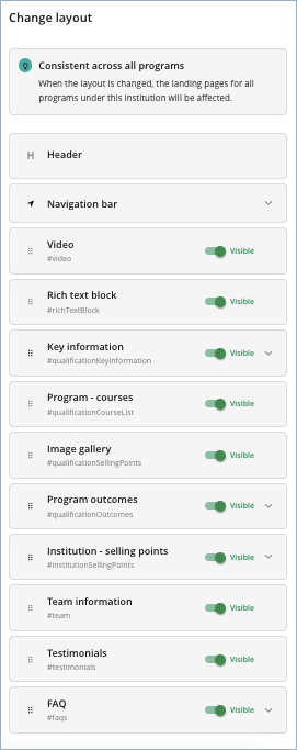 You can use the layout settings to be consistent across all programs. When the layout is changed, the landing pages for all programs under this institution will be affected.