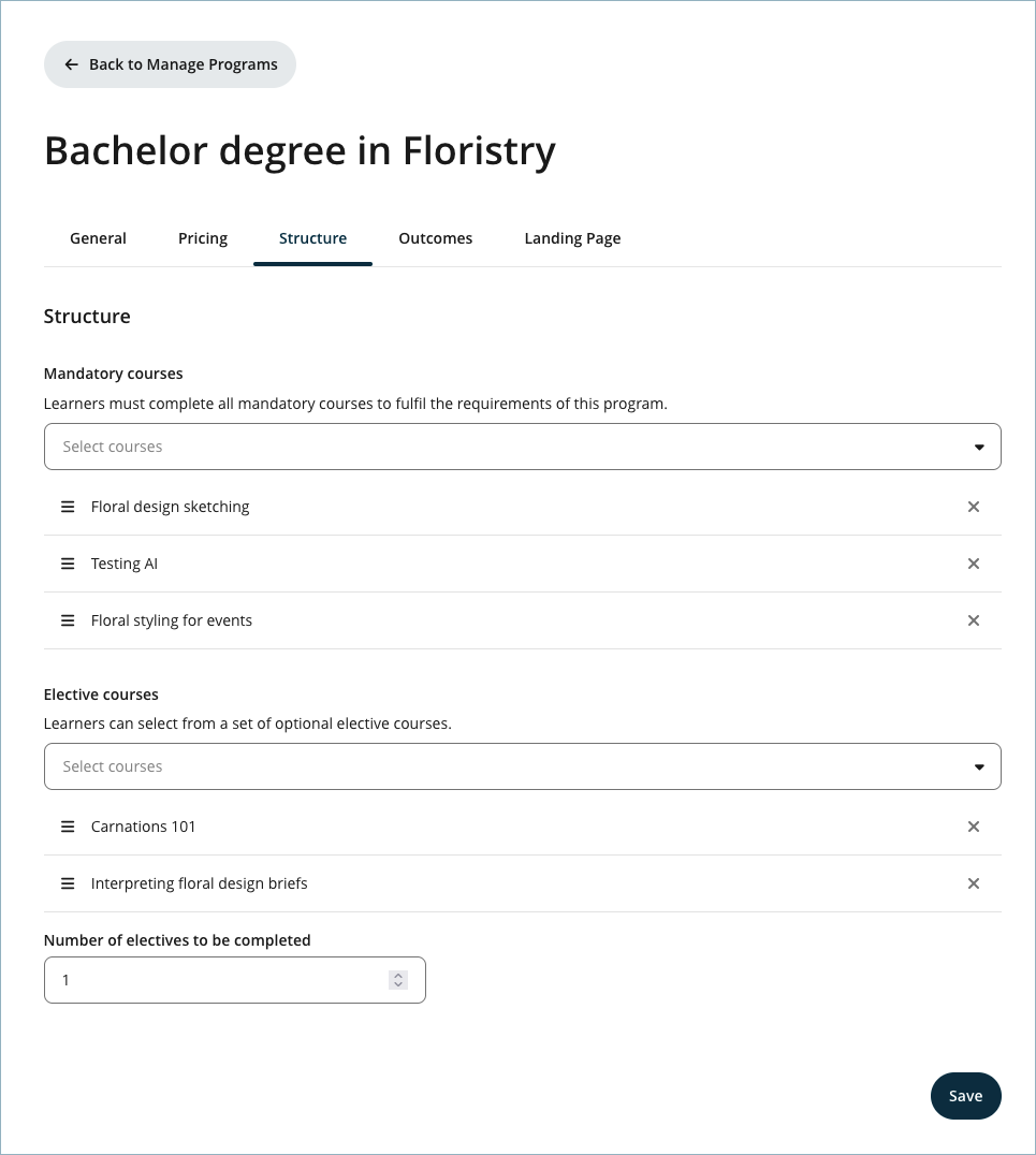 The ‘Program’ is a feature in OpenLearning that allows you to combine multiple courses into a single package where you can have both the Core (required) courses and Elective (optional) courses. Please note that the title is customisable, eg qualification, program, degree, certificate, etc.