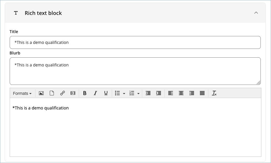 9. Rich text block. The title, blurb and description can be configured in this section. The values you configure here will be displayed beneath the promotional video, provided a video is set.