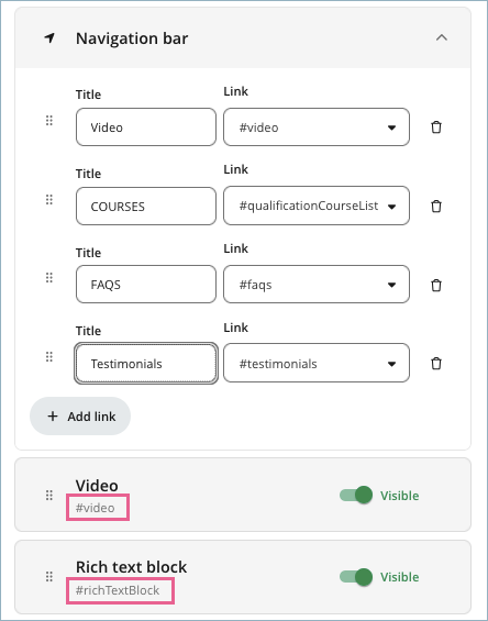 2. Navigation bar. Similar to the institution landing page, the program landing page also allows you to set a navigation bar. When a user clicks a navigation item, they will be taken to the corresponding section. Each link points to a section identified by its hashtag, for example, #video for the video section.