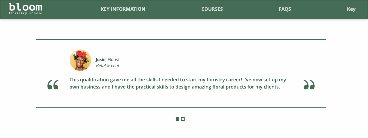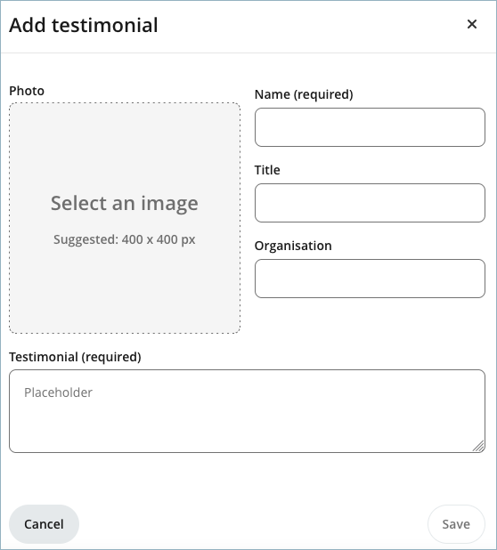 7. Testimonials. Testimonials can be added by selecting the Add testimonial button. For each new testimonial, the following details can be included: