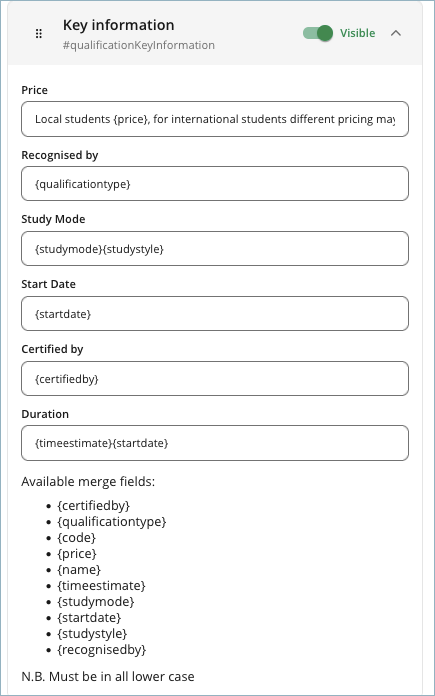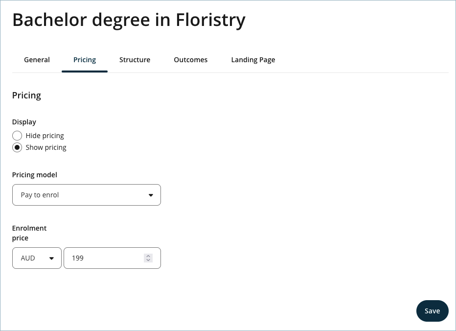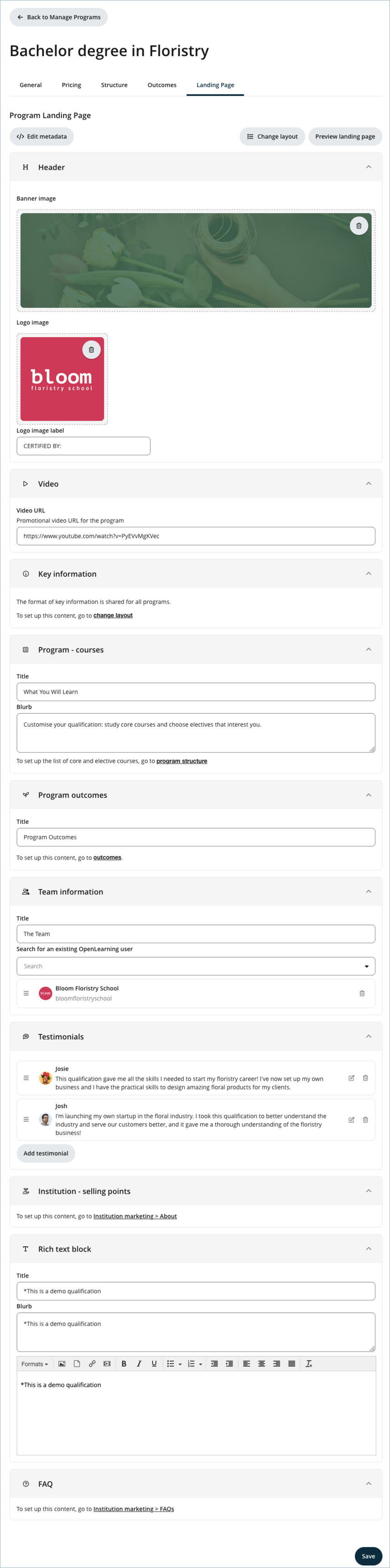 Once a program has been created, the Landing Page tab becomes available and can be selected. Each qualification has its own landing page, similar to a course landing page: