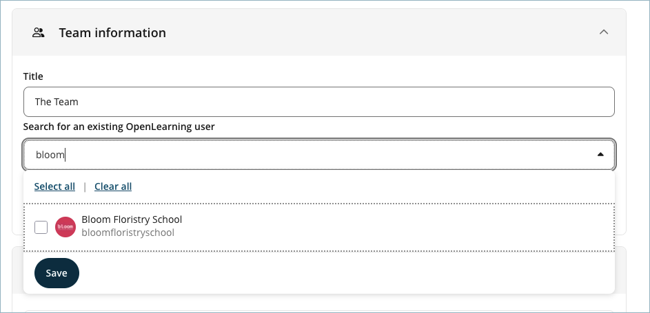 6. Team information. The title and team members can be configured in this section. To add a team member, you can search by using the name, profile name or email address.