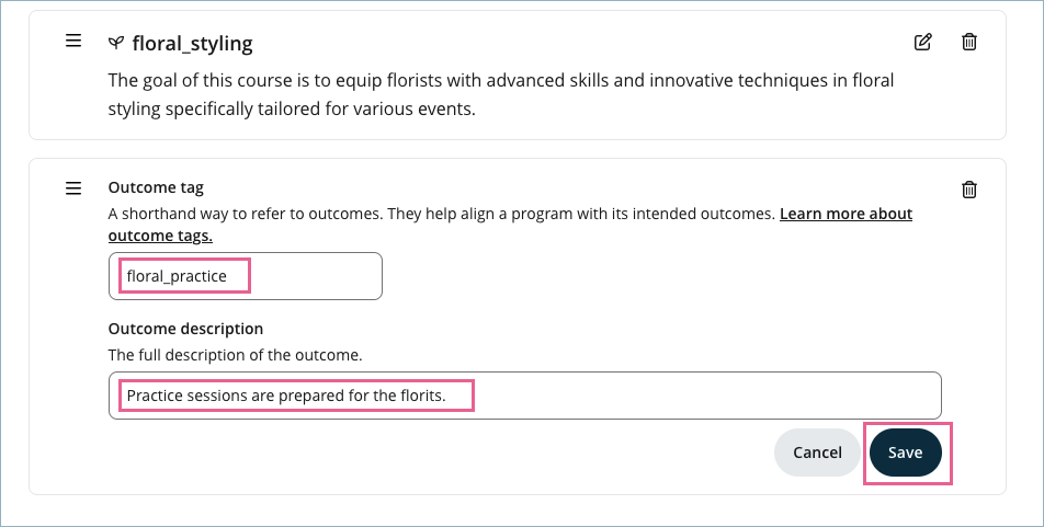 Fill in the Outcome tag and the Outcome description. Click Save to apply the changes.