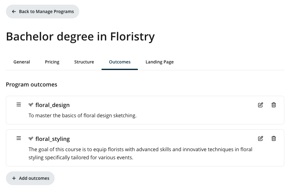 Program outcomes can be configured in the outcomes tab. To add an outcome, please follow the steps below.