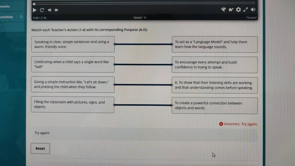 I have a trouble when submitting the Match Teacher's Action (1-4) with its corresponding Purpose (A-D). The answer always incorrect and rejected. But, when I click the button reset, only the answers is being reset by the server. Unfortunately, the words ( try again and incorrect) don't leave the server even when i tried to push the button reset for several times or refresh the page.