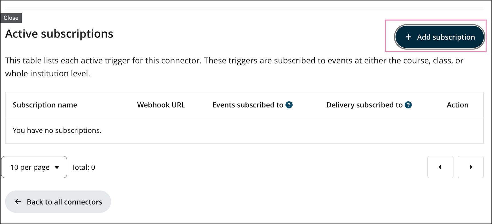Navigate back to the Webhook Connector section under Institution Settings > Connected Apps. The new subscription will now appear under the Active Subscriptions of the connector that you have created.