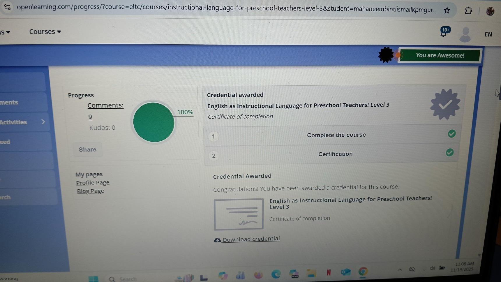I have completed the course ELTC level 3 and the certificate is awarded, but to download the certificate by clicking the "Download credential" shows : "this www.openlearning.com page can't be found"