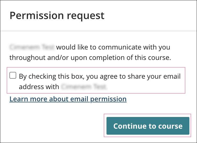 2. Learners already enrolled in a course will be prompted with a pop-up box permission request on the course homepage, where they have to select a mandatory checkbox to continue. By checking this box, the learner agrees to share their primary email address with the course provider.