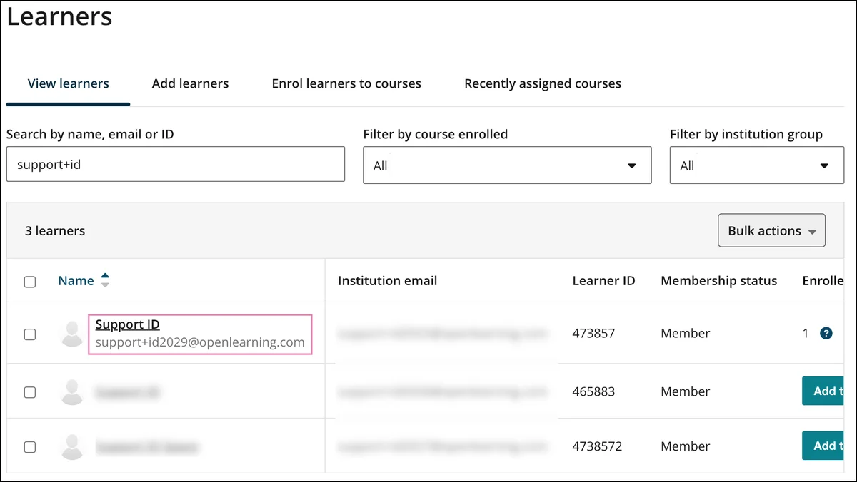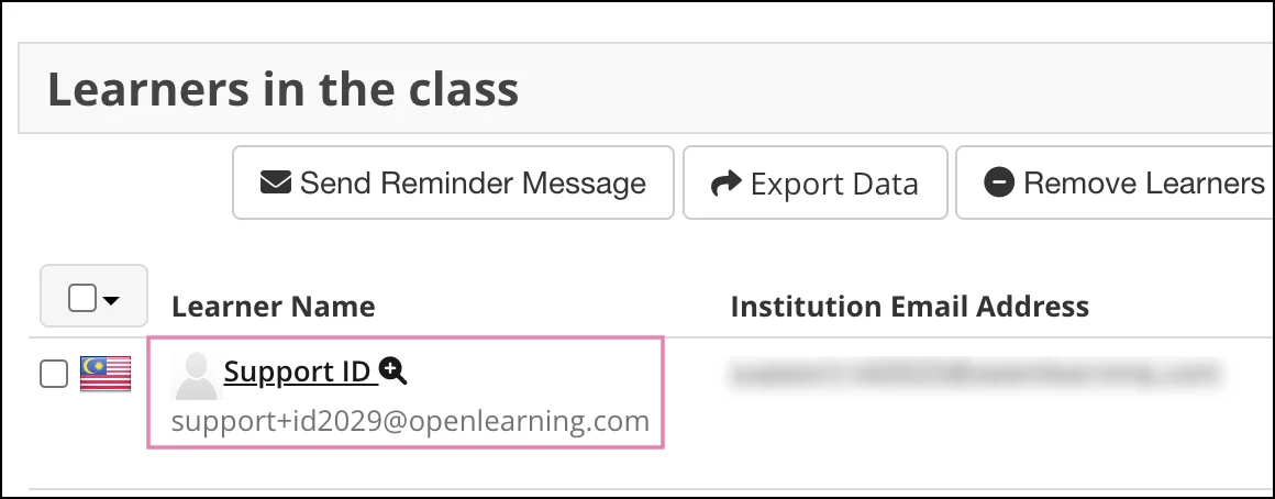 Institution UI - Manage learners / Manage team table (below the learner's name)