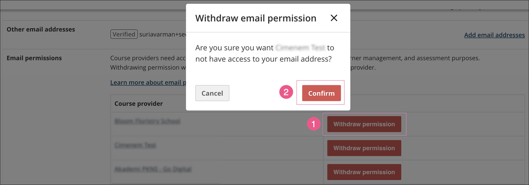 The Email permissions section in the learner’s Account Settings lists all institutional course providers who have been granted permission to see the learner’s email address. When clicking on the Withdraw permission button against each of these providers, there will be a confirmation pop-up box, which then proceeds to remove the learner’s email address from the consent registry of that institution.