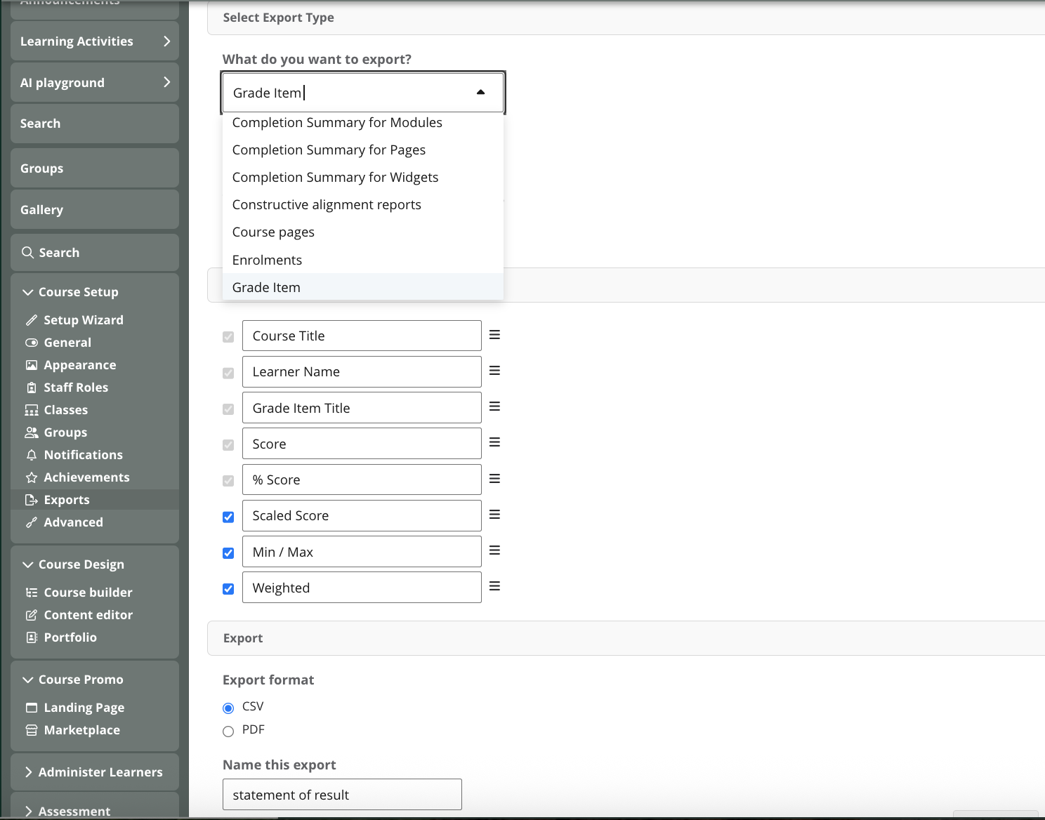 Export a detailed breakdown of grade item's final results for learners in your course.