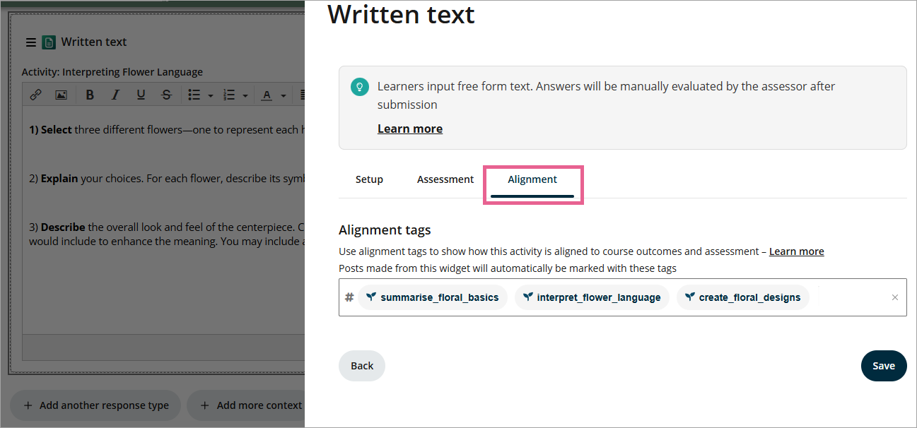 Click on the Assessment tab and you can also include assessment guidelines when setting up the question. These guidelines will be visible to Assessors during grading.