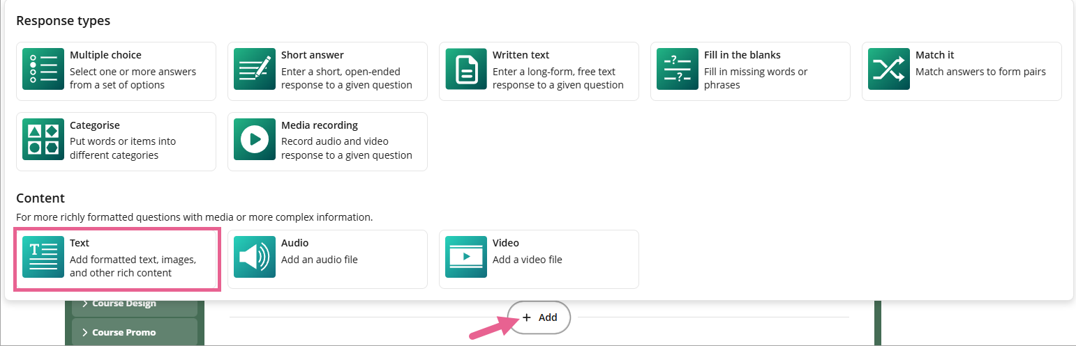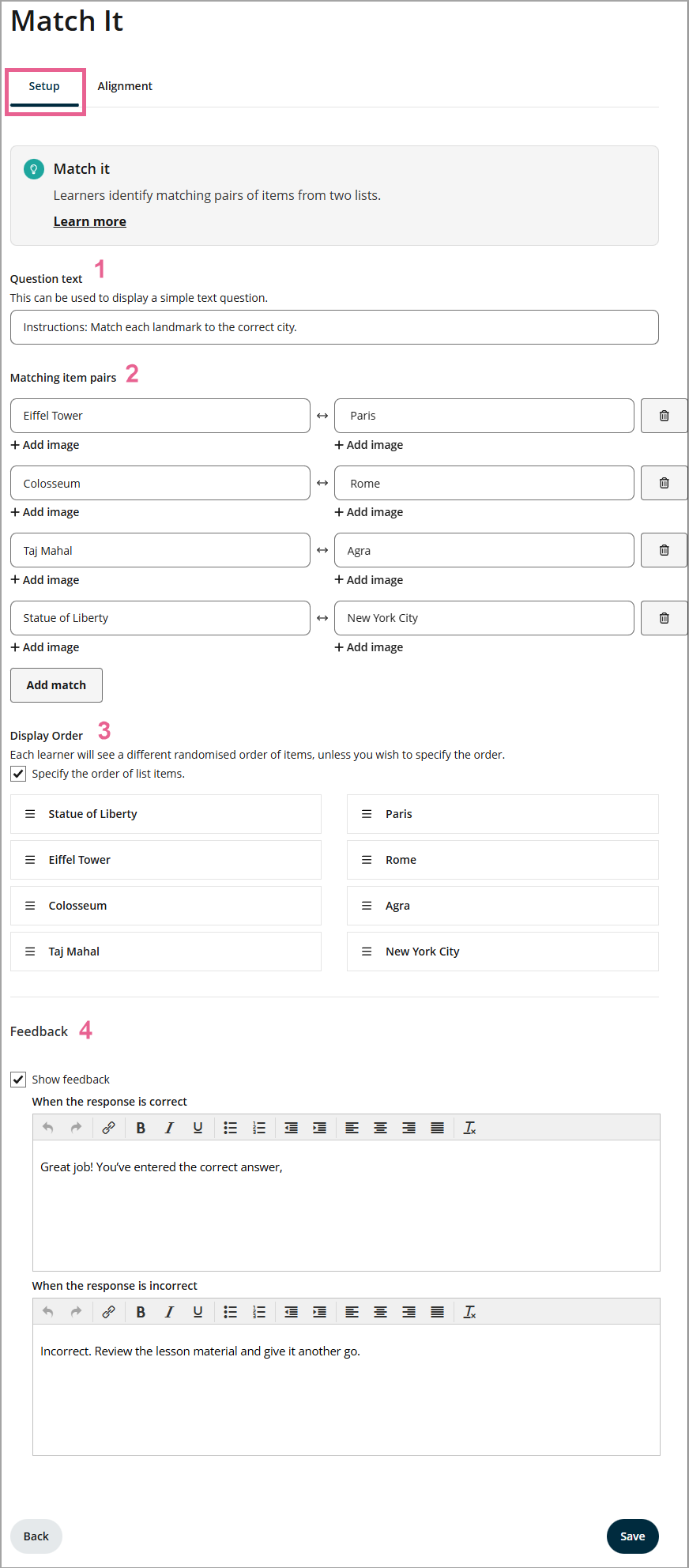 The Match it response type allows learners to pair related items from two lists — for example, matching terms with their definitions or questions with their correct answers.