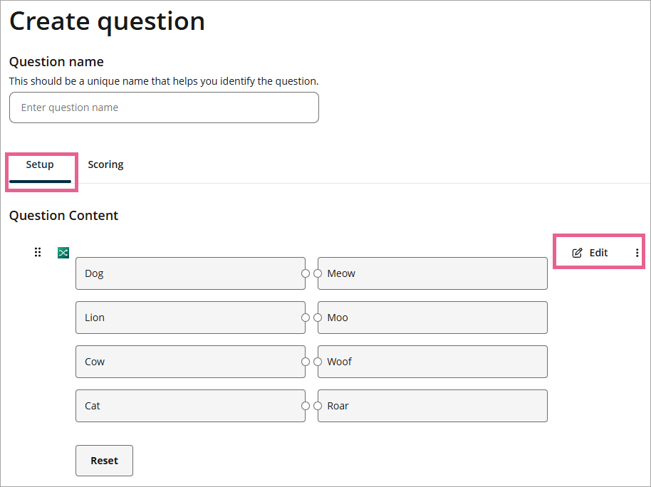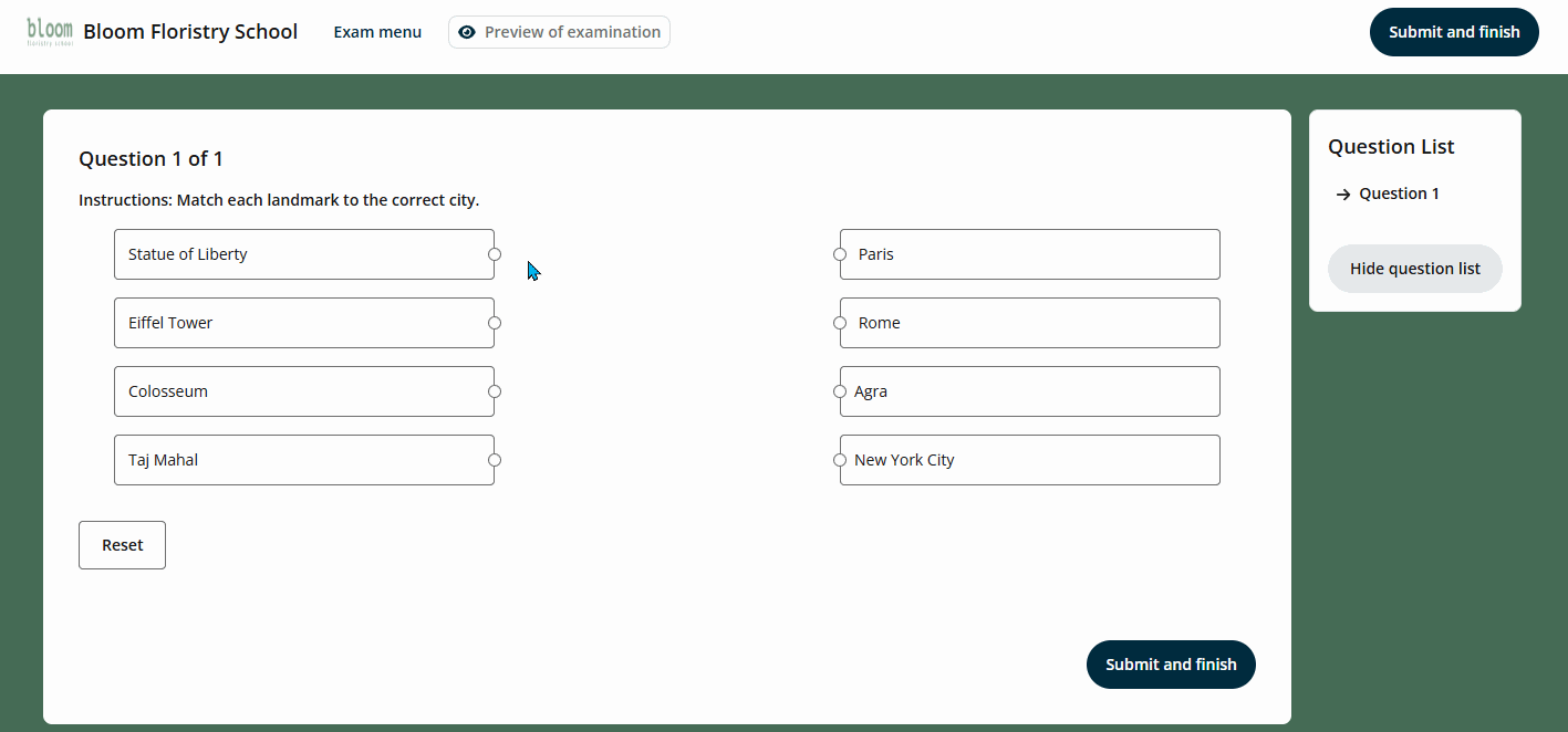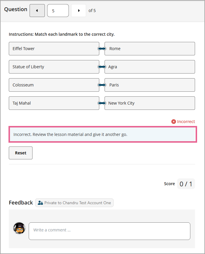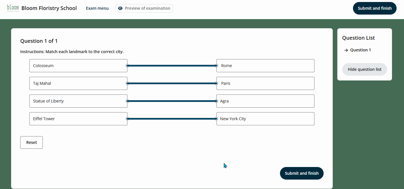 They can also click the Reset button to reset all matches or answers before submitting.