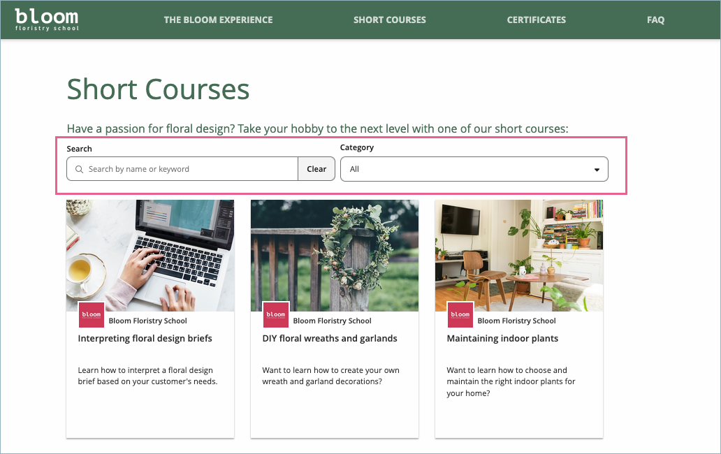 The course search feature on the portal or institution landing page is designed to make it easier for learners to discover courses.