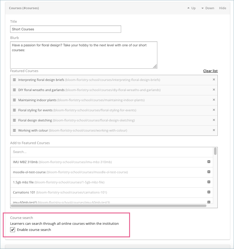 Tick the “Enable course search” checkbox under the Courses Categories and Courses section.