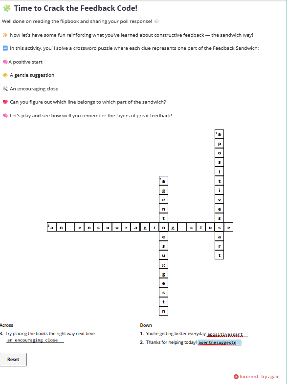 the problem with crossword and categorise feedback question. i've done multiple time but still can't complete the system