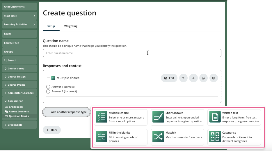Assessment designers can easily add their questions to an exam, and in the future, to a quiz activity on the block page