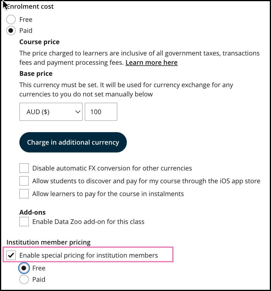 Select Paid to set your institution’s special pricing, or choose Free for free access.