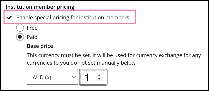 Scroll down to the Institution member pricing section and tick the checkbox - Enable special pricing for institution members