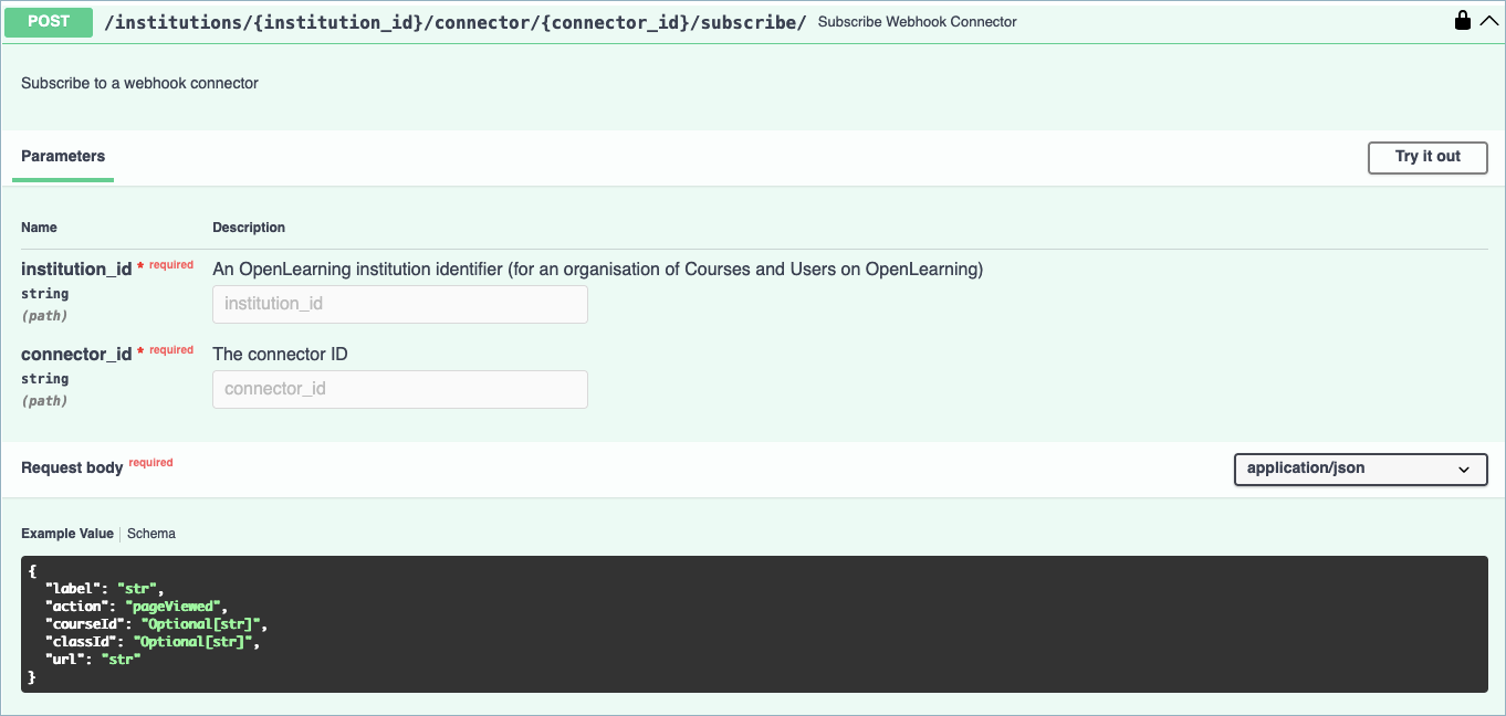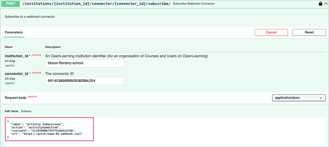 Once a webhook connector has been created, the next step is to subscribe to user events. For example, to receive a webhook each time a learner performs a specific action in an OpenLearning course.