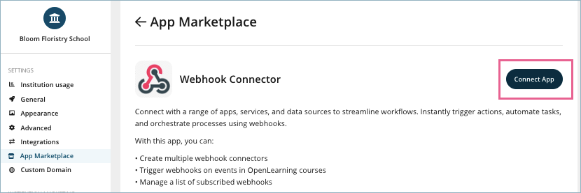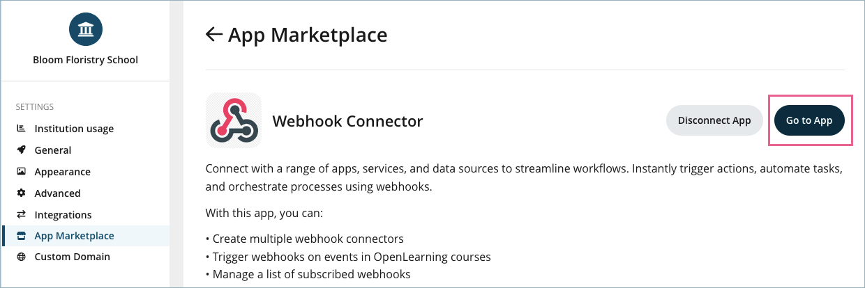 To configure automatic tracking, go to the Institution Settings > Settings > App Marketplace menu and then click on the Webhook Connector.