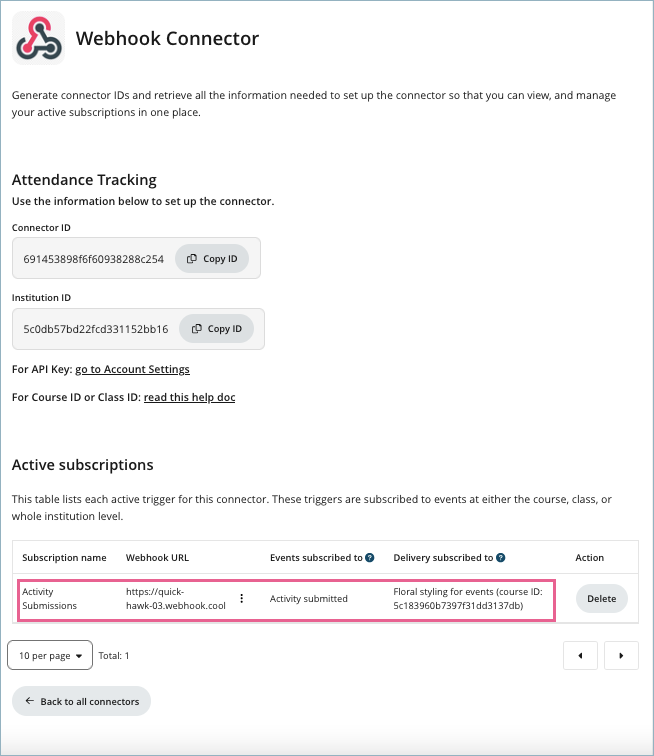 Once created, the new active subscription will appear in the Webhook Connector > Active Subscriptions list.