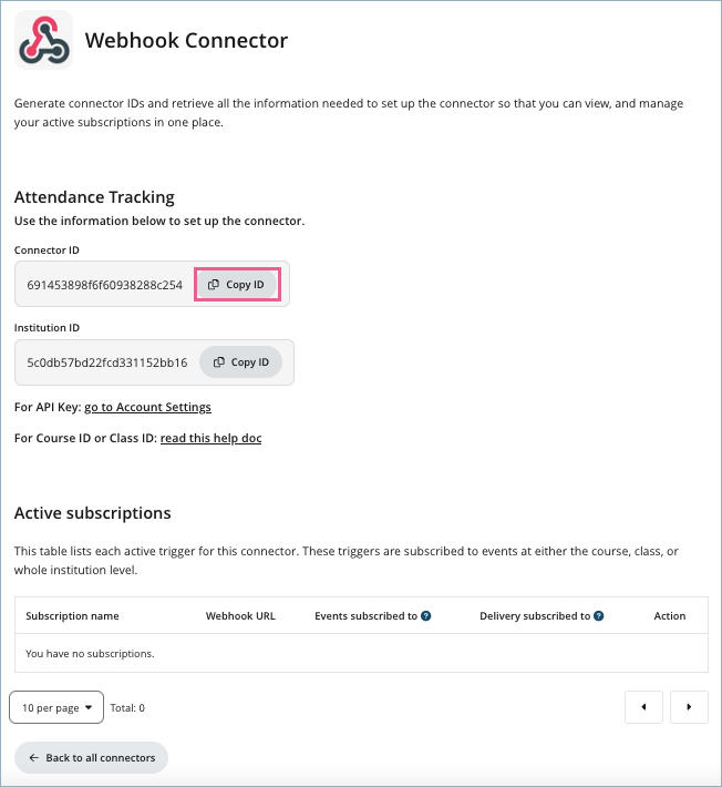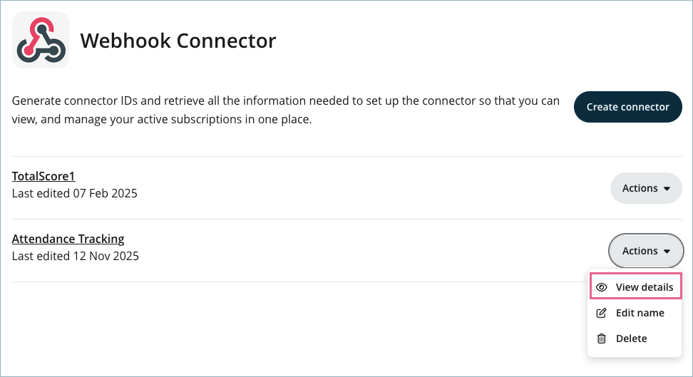 Subscription to the created webhook connector can only be performed using the API endpoint provided below.