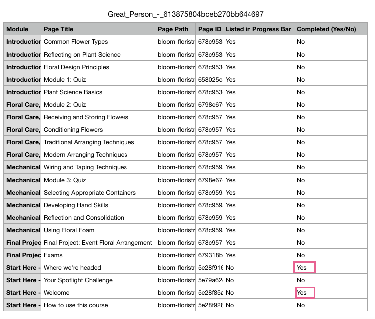 The exported file in the zip file will have each learner's page completion report in the CSV format. Each CSV file for each learner contains the column name Completed (Yes/No) and the value will show Yes if the page has been completed by the learner.
