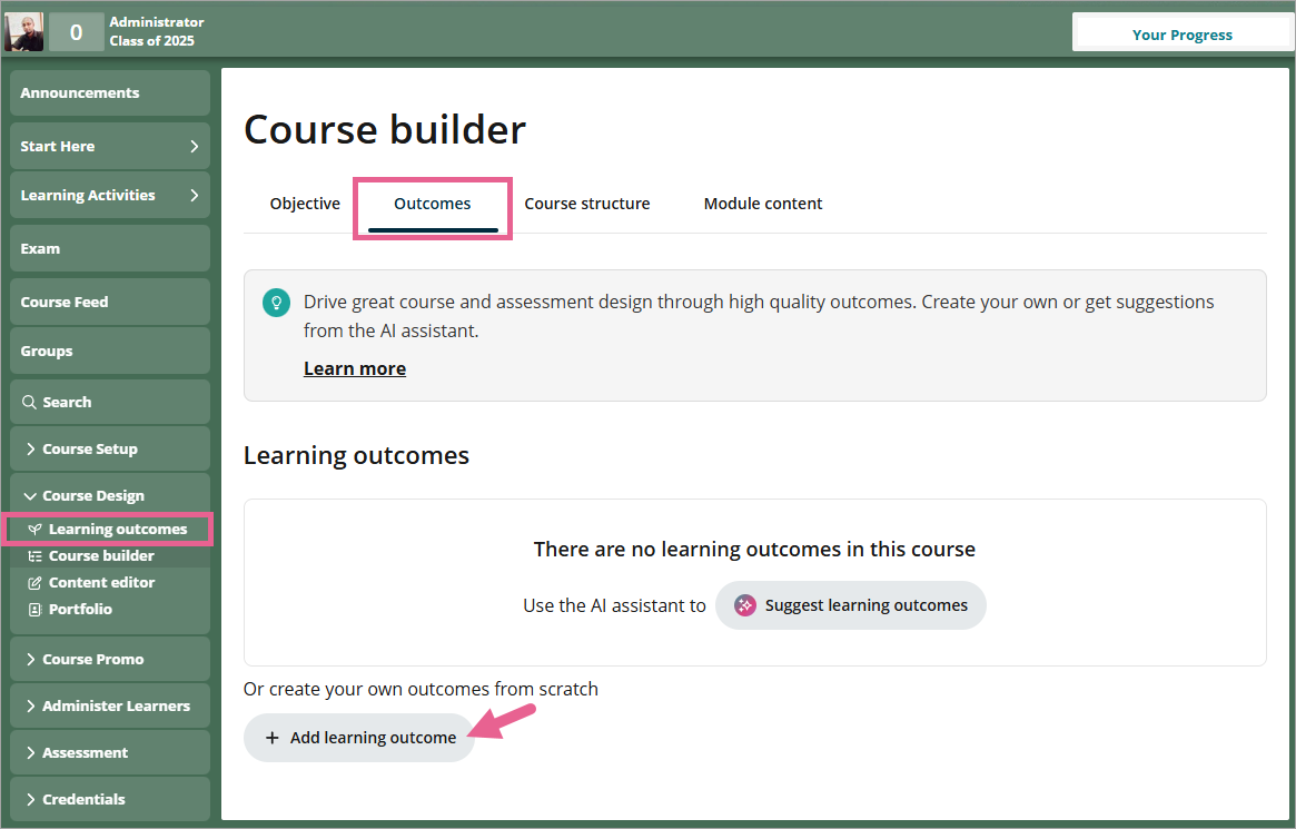 In OpenLearning, you can set up course objective, learning outcomes as well as outcome tags.