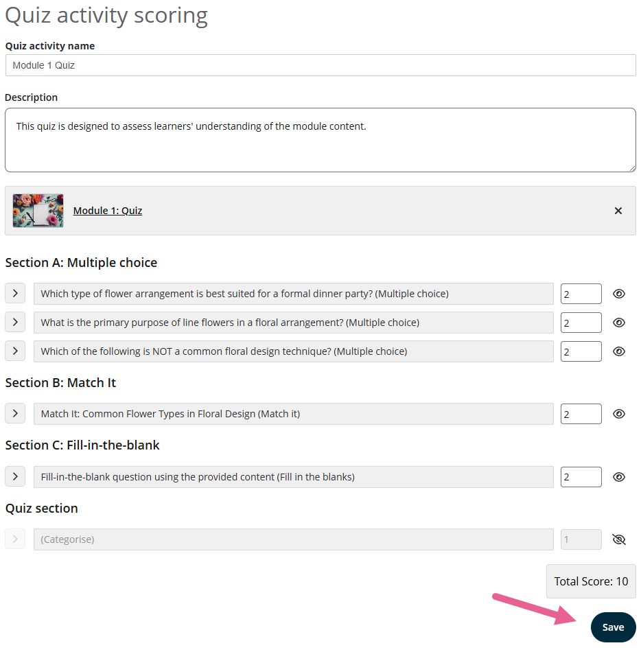 - Quiz activity name: The name of your grade item report will appear here. You can edit it if you wish.