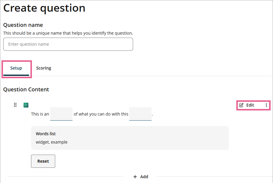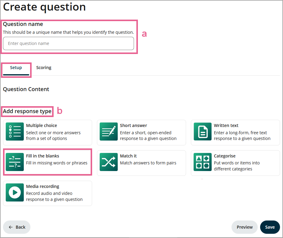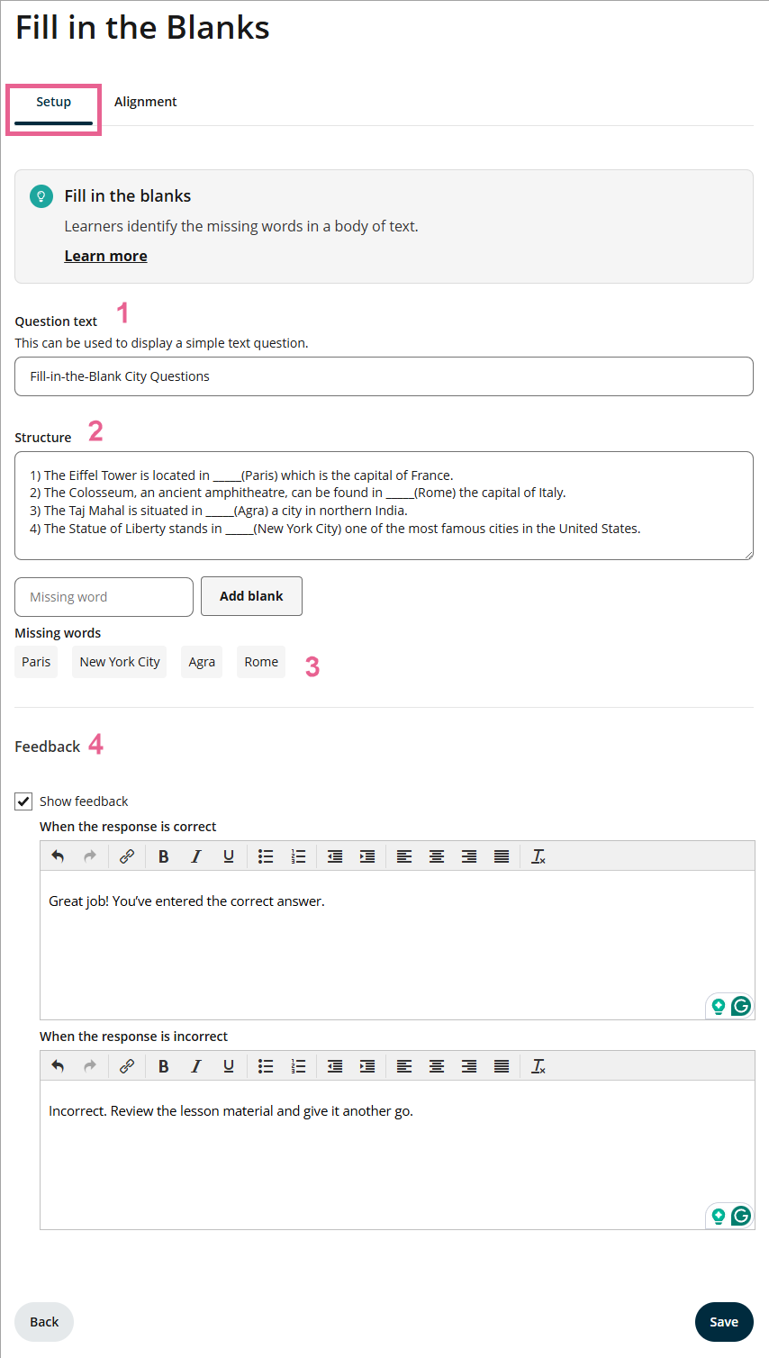 The Fill in the blanks response type can be used to set up questions where the learners must fill in the missing word in a sentence.