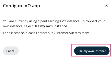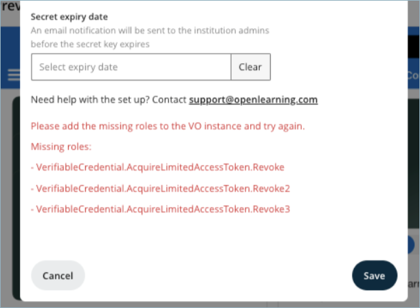 To complete the setup successfully, OpenLearning will verify whether your configured VO instance has the required Application Roles. If any roles are missing, you may encounter an error message like the one shown below.