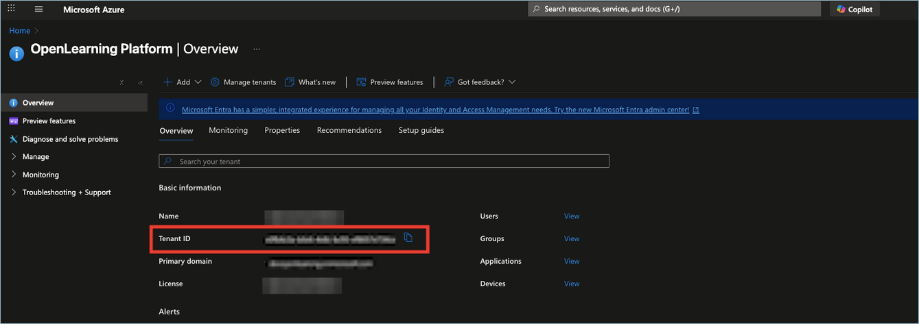 In your Microsoft Entra ID portal, go to the Overview section, where your Tenant ID will be displayed.