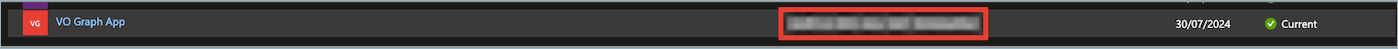 Locate your VO registered app. You will find the Application ID listed there, for example: a12c9e45-7b8d-42f1-93de-8c6a1f4bd902