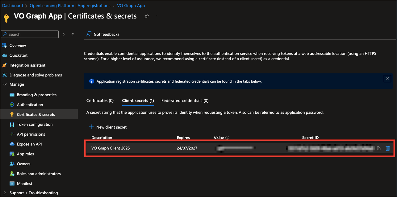 Azure secrets have expiry dates, and your VO integration will stop working if the client secret expires. To mitigate this, you can enter the estimated expiry date, and we will remind you to renew the client secret before it expires.