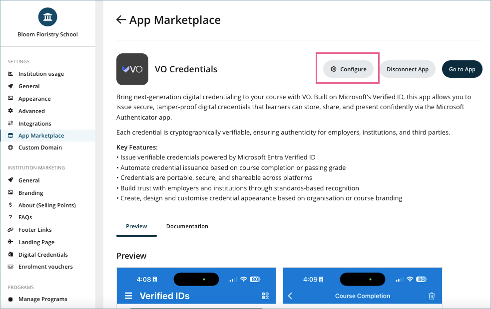 Go to the Institution Settings > Settings > App Marketplace menu and click the Verified Orchestration app from the OpenLearning App Marketplace. Click the Connect App and then the Go to App button.