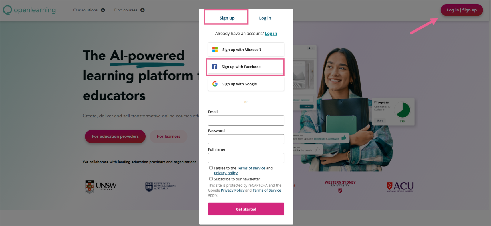 OpenLearning also offers convenient Single Sign-On (SSO) options. You can quickly create your account using Microsoft, Facebook, or Google: