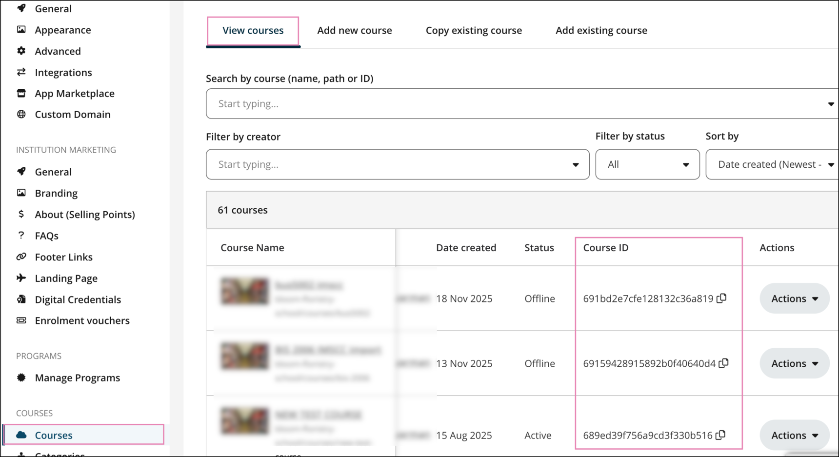 If you are a portal administrator, you can get the Course ID from your portal interface: