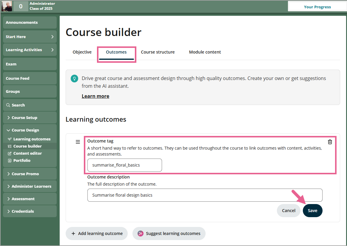 Set up your learning outcomes by clicking Add learning outcome button at the bottom of the page.
